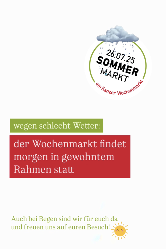 Der Ilanzer Wochenmarkt findet wie gewohnt von 08:00 – 12:00 Uhr in üblicher Formation statt. Einige unserer Marktstände werden auch am Nachmittag vertreten sein.